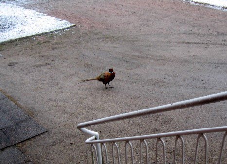 We have been watching birds through the window and in our yard, listing the species from the beginning of the year. The list is 30 names long now. We also get to know some regular visitors, and occasionally give them names. There is this pheasant cock, arrived some weeks ago and now the proud husband of five hens. Naturally he must protect his ladies from other cocks.